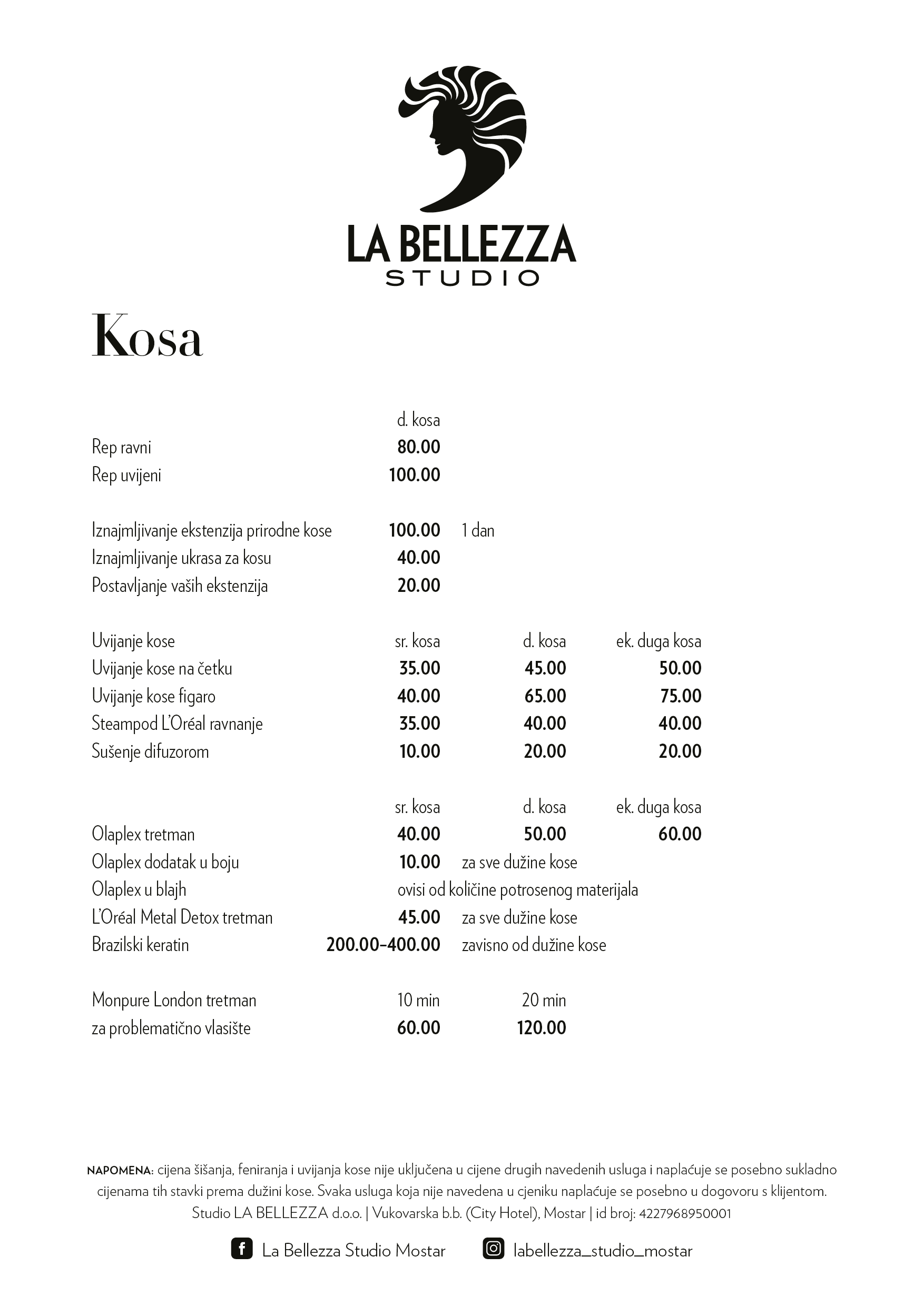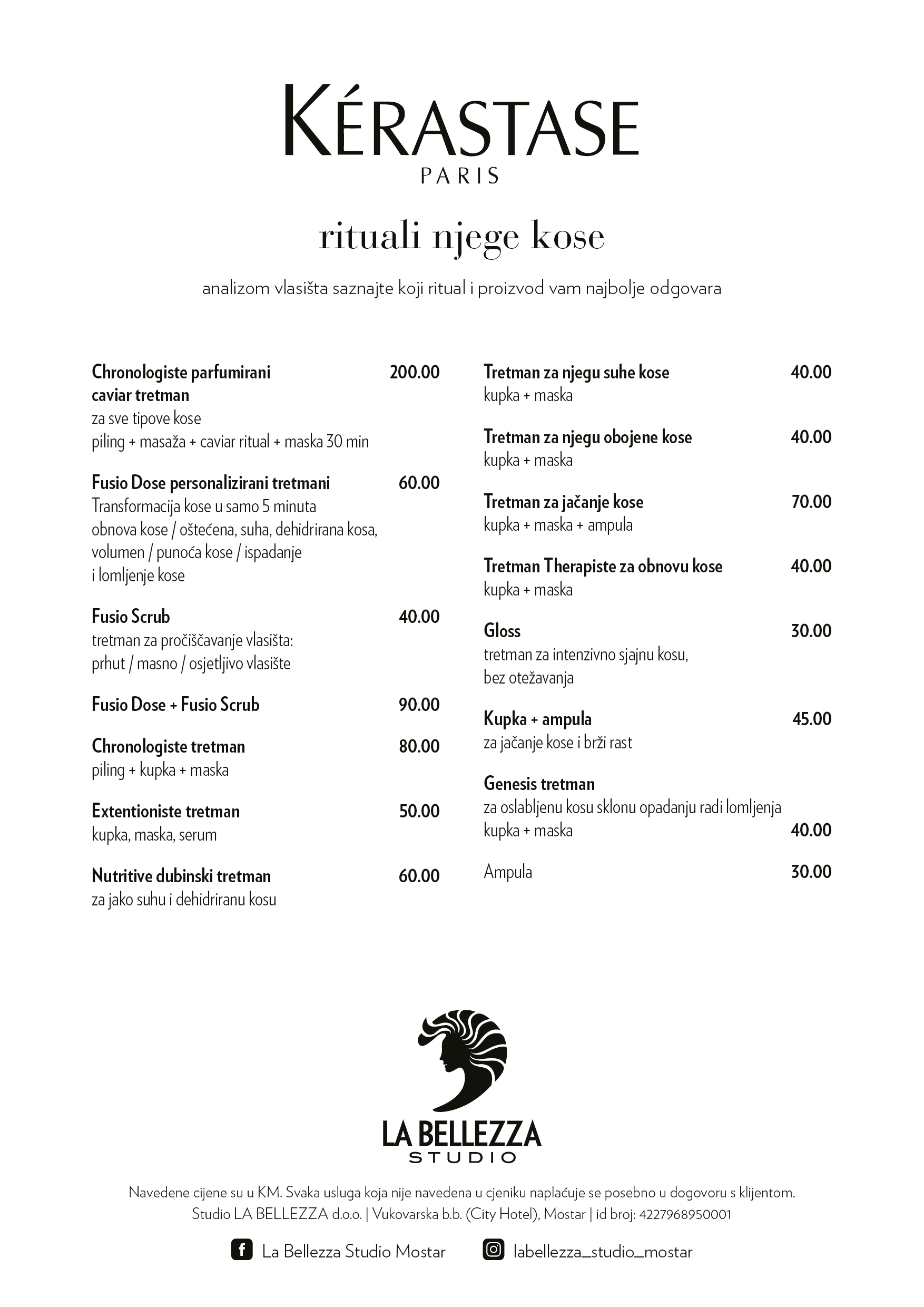 Nudimo širok dijapazon usluga poput analize vlasišta, hairsyle, svečanih frizura, balayage, ekstenzije od prirodne kose, brazilski keratin i slično. Ističemo tretmane: Brazilsko feniranje, Olapex tretman, Kerastase Fusio tretmani, Chronologiste Caviar tretman, Extensioniste, Fusio scrub, K Water Genesis tretman…
